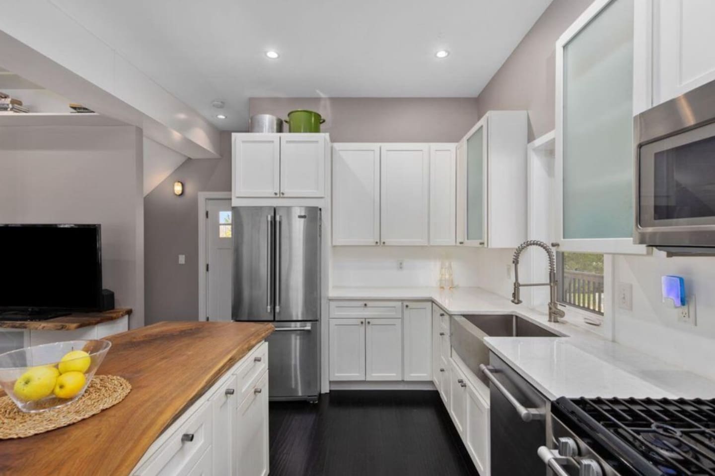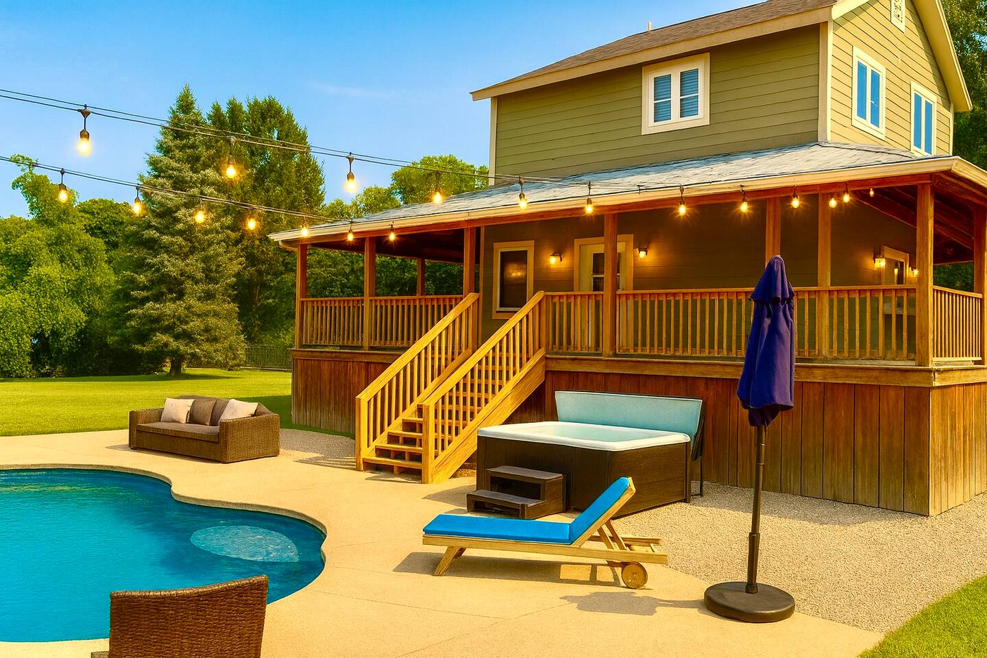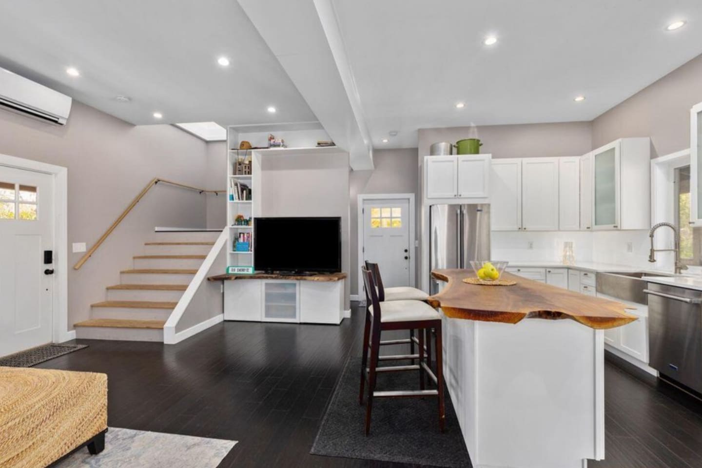 Experience the allure of our hospitable oasis, presenting four tastefully furnished bedrooms: a serene master suite with a queen bed on the upper level, alongside another charming queen bedroom, and an enchanting full bed nestled in a custom-built loft that offers delight for kids and young adults alike. The basement features a queen bed for added tranquility and a queen sleeper sofa for extra guests. Our outdoor apartment, equipped with AC and heat, offers a queen bed for year-round comfort, while its full bathroom is accessible during the summer months. The dining area, with its welcoming island and round table, sets the stage for unforgettable dining and conversation. Lounge in the ample living room on a large sectional, and utilize the fully outfitted kitchen to whip up delectable dishes. The home includes three full bathrooms with showers, a downstairs bathtub for soaking, and an additional half bath on the ground floor. Entertainment abounds in our expansive backyard paradise, showcasing a custom built 16-foot heated pool with a depth of 4-5 feet, a large hot tub, a spacious fenced in yard with a fire pit, and an outdoor bar. A ping pong table, outdoor shower, bathroom, and more await to ensure your days end as perfectly as they begin.